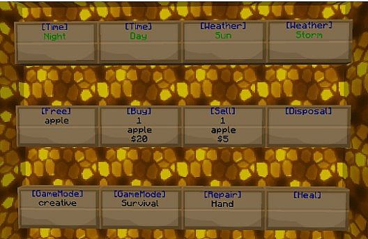 - Wbudowane funkcje ekonomiczne, w tym sklepy z tabliczkami, koszt za użycie komend i pełne wsparcie dla pluginu Vault.