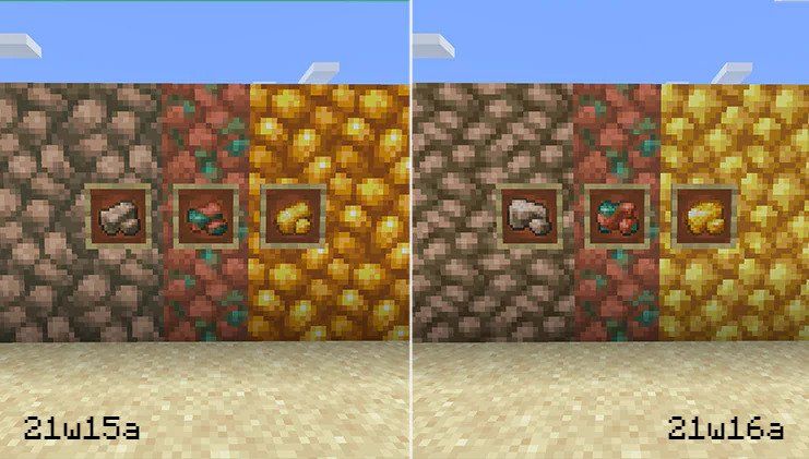 Firma Mojang zaprezentowała nowy snapshot 21w16a wprowadza wiele zmiany do azalii i nacieków. Ponadto Mojang poprawił wygląd tekstur surowych rud. Wprowadzono również kilka dodatków do pakietu podglądowego Caves & Cliffs.